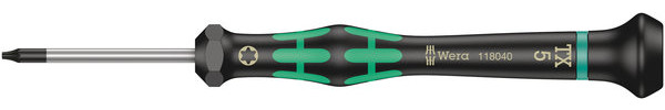 2067 Elektronik innensechsrund Schraubendreher, TX 5 x 40 mm Hochwertiger Wera Micro Schraubendreher für feinmechanische Verschraubungen. Durch Abstützen der Hand auf der Drehkappe und durch die Schnelldrehzone unterhalb der Drehkappe ist blitzschnelles Zwirbeln möglich. Zeitintensives Umgreifen entfällt. Kraftzone mit integrierten Weichzonen sorgt für die Übertragung hoher Löse- und Anzugsmomente. Präzisionszone für den richtigen Drehwinkel bei Justierarbeiten. Die Wera Black Point-Spitze bietet Passgenauigkeit und optimierten Korrosionsschutz. Take it easy Werkzeugfinder mit Farbkennzeichnung nach Profilen und Größenstempelung - zum einfachen und schnellen Finden des benötigten Werkzeugs. 05118040001