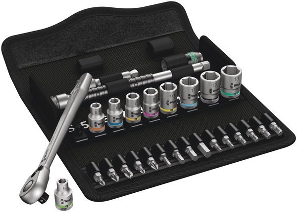 8100 SA 8 Zyklop Metal-Knarrensatz, Umschalthebel, 1/4"-Antrieb, metrisch, 28-teilig 1x 8004 A Zyklop Metal-Knarre mit Umschalthebel mit 1/4"-Antrieb: 1/4" x 141 mm 9x 8790 HMA Zyklop-Steckschlüsseleinsatz mit 1/4"-Antrieb: 5x23 mm, 5,5x23 mm, 6x23 mm, 7x23 mm, 8x23 mm, 10x23 mm, 11x23 mm, 12x23 mm, 13x23 mm 1x 8794 LA Zyklop-Verlängerung mit Schnelldrehhülse, lang, 1/4": 1/4" x 150 mm 1x 8794 A Zyklop-"Wobble"-Verlängerung, 1/4": 1/4" x 56 mm 1x 8784 A1 Zyklop-Verbindungsteil, 1/4": 1/4" x 37 mm 3x 851/1 Z Bits: PH 1x25 mm, PH 2x25 mm, PH 3x25 mm 2x 855/1 Z Bits: PZ 1x25 mm, PZ 2x25 mm 6x 867/1 innensechsrund Bits: TX 10x25 mm, TX 15x25 mm, TX 20x25 mm, TX 25x25 mm, TX 27x25 mm, TX 30x25 mm 4x 840/1 Z Bits: 3x25 mm, 4x25 mm, 5x25 mm, 6x25 mm 1x Klettstreifen 120: 120 x 50 mmUnglaublich kompakte Satzanordnung für viel Werkzeug auf engem Raum. Völlig neues Knarrensatz-Gefühl dank neuartiger textiler Boxen mit sehr hoher Robustheit und Langlebigkeit. Aufrecht positionierbar zur übersichtlichen Lagerung im Werkstattregal. Zusätzlicher Oberflächenschutz durch textiles Außenmaterial. Geringes Gewicht und Volumen für vereinfachte Mobilität.Mit Werkzeugfinder "Take it easy": Farbkennzeichnung nach Größen. 05004018001