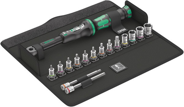 Das 16-teilige Set vom Schraubwerkzeugspezialist Wera löst die wichtigsten Schraubprobleme rund ums Fahrrad bei zuverlässiger Kontrolle der aufgebrachten Drehmomente zum Schutz der sensiblen Bauteile. Mit Klick-Drehmomentschlüssel im unverkennbaren Wera Design. Sehr robuste Ausführung bei hoher Genauigkeit gemäß DIN EN ISO 6789-1:2017-07. Einfache Einstellung und Sicherung des Vorgabewertes. Das hör- und fühlbare Einrasten bei Erreichen der Skalenwerte erleichtert zusätzlich die sichere Einstellung des gewünschten Drehmomentwertes. Die robuste Auslösemechanik garantiert ein deutlich hör- und fühlbares Auslösesignal bei Erreichen des eingestellten Drehmomentes. Für Rechtsanzug und mit Umschaltknarre mit 45 Zähnen. Der Drehmomentschlüssel ist extrem platzsparend, ergänzt um, zum Drehmomentbereich passenden und auf die gängigsten Schraubverbindungen bei Fahrrädern angepassten, Zubehör, in einer robusten, oberflächenschonenden textilen Box verpackt. Enthalten sind: Click-Torque A 5, 1/4", 2,5 - 25 Nm, 4 Nüsse mit 1/4" Antrieb, 7 Hex-Plus Innensechskant-Bitnüsse und 4 innensechsrund Bitnüsse. Nüsse und Bitnüsse mit "Take it easy" Werkzeugfinder mit Farbkennzeichnung nach Größen - zum einfachen und schnellen Finden des benötigten Werkzeugs. Bitnüsse mit Haltefunktion für besonders komfortables Schrauben, ohne dass die Schraube vom Werkzeug fällt. Unglaublich kompakte Satzanordnung für viel Werkzeug auf engem Raum. Textile Box mit sehr hoher Robustheit und Langlebigkeit. Zusätzlicher Oberflächenschutz durch textiles Außenmaterial. Geringes Gewicht und Volumen für vereinfachte Mobilität. Bitnüsse mit allen Vorteilen der Wera Bit-Technologie wie z.B. Passgenauigkeit, Verschleißfestigkeit und Rundlaufeigenschaften. 05004180001