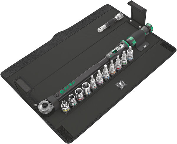Click-Torque C 3 Set 1, 40-200 Nm, 13-teilig 1x Click-Torque C 3 Drehmomentschlüssel mit Umschaltknarre, 40-200 Nm: 1/2" x 40-200 Nm 4x 8790 HMC Zyklop-Steckschlüsseleinsatz mit 1/2"-Antrieb: 10x37 mm, 13x37 mm, 17x37 mm, 19x37 mm 4x 8767 C HF innensechsrund Zyklop Bitnuss mit 1/2"-Antrieb mit Haltefunktion: TX 30x60 mm, TX 40x60 mm, TX 45x60 mm, TX 50x60 mm 3x 8740 C HF Zyklop Bitnuss mit 1/2"-Antrieb mit Haltefunktion: 6x60 mm, 8x60 mm, 10x60 mm 1x 8794 SC Zyklop-Verlängerung mit Schnelldrehhülse, kurz, 1/2": 1/2" x 125 mmKlick-Drehmomentschlüssel-Set im unverkennbaren Wera Design. Sehr robuste Ausführung bei hoher Genauigkeit gemäß DIN EN ISO 6789-1:2017-07. Einfache Einstellung und Sicherung des Vorgabewertes. Das hör- und fühlbare Einrasten bei Erreichen der Skalenwerte erleichtert zusätzlich die sichere Einstellung des gewünschten Drehmomentwertes. Die robuste Auslösemechanik garantiert ein deutlich hör- und fühlbares Auslösesignal bei Erreichen des eingestellten Drehmomentes. Für Rechtsanzug und mit Umschaltknarre mit 45 Zähnen. Drehmomentschlüssel und drehmomentkompatibles Zubehör sind extrem platzsparend in einer robusten, oberflächenschonenden textilen Box verpackt. Enthalten sind: Click-Torque C 3, 1/2", 40 - 200 Nm, 4 Nüsse mit 1/2" Antrieb, 7 Hex-Plus Innensechskant- und innensechsrund Bit-Nüsse plus Verlängerung. 05075680001