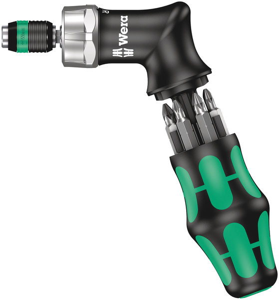 Kraftform Kompakt Pistol RA, 7-teilig 1x 814 RA Kraftform Freilauf-Schraubendreher: 1/4" 2x 851/1 Z Bits: PH 1x25 mm, PH 2x25 mm 2x 855/1 Z Bits: PZ 1x25 mm, PZ 2x25 mm 2x 867/1 innensechsrund Bits: TX 20x25 mm, TX 25x25 mmWera Kompaktwerkzeug mit mehrkomponentigem Kraftform Pistolengriff für hohe Arbeitsgeschwindigkeiten und besonders ergonomisches Verschrauben. Integriertes Bit-Magazin im Griff. Inklusive Ratsche: Feinverzahnung für geringen Rückholwinkel von nur 8°, Umschaltring (rechts, fest, links), maximales Drehmoment von bis zu 50 Newtonmetern, Sechskant-Klinge mit 1/4"-Innensechskantaufnahmemit Rapidaptor-Technologie, magnetisch. 6 Bits PH, PZ und innensechsrund in 25 mm Länge, passend für Halter nach DIN ISO 1173-D 6,3. Mit praktischem Halfter zur Befestigung am Gürtel. 05051030001