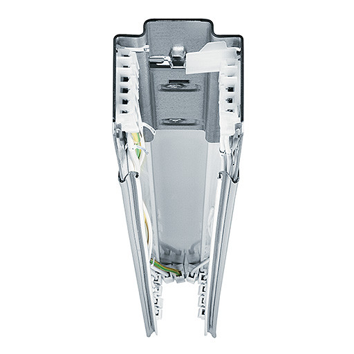 Elektrische Ausspeisung flexibel silber aus profiliertem Stahlblech für den elektrischen Anschluß des Lichtbandes. Steckbare Anschlußklemmen für 5 Netzleitungen, 2 x 2 Notlichtleitungen und 2 Steuerleitungen. Abmessungen: 1000 x 60 x 56 mm, Gewicht: 1,97 kg