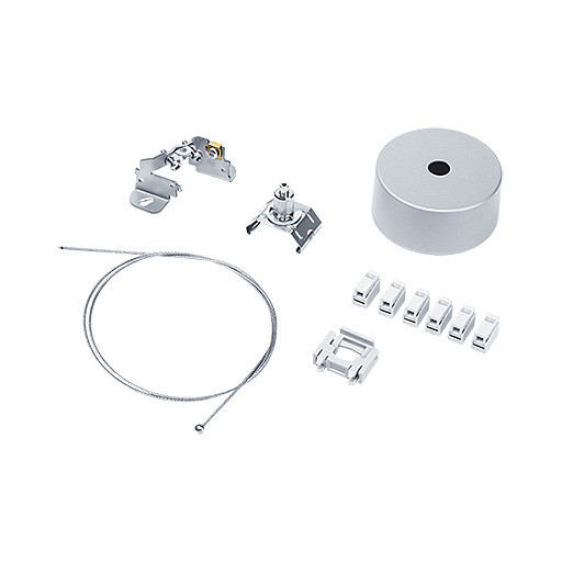 Seilabhängung 1000 mm in Silber inkl. rundem Baldachin mit stufenloser Höhenverstellung aus verzinktem Stahlseil. Seilabhänger und Deckenbefestigungselement. Elipsenförmiger Baldachin aus Kunststoff mit Klemmmöglichkeit für 6 Pole und Erde. Befestigungsfeder aus nichtrostendem Federstahl. Einspeisungskabel sind nicht enthalten und separat zu bestellen. Höhe: 1000 mm, Gewicht: 0,1 kg