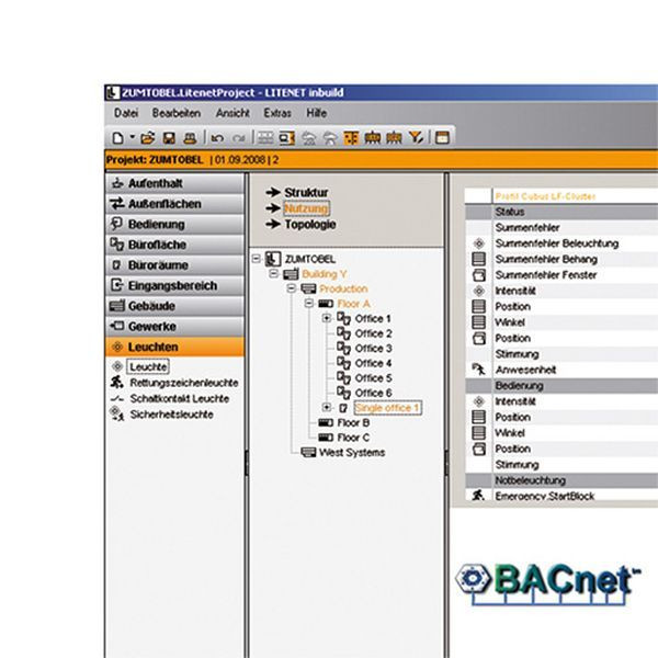 Software Interface 3.000 Datenpunkte für den Datenaustausch der ZUMTOBEL Lichtmanagement Lösung LUXMATE LITENET mit einem System der Gebäudeleittechnik unter Verwendung des offiziellen BACnet Netzwerkprotokolls. (Building Automation and Control Networks Standards) Auszug Datenpunkte: Anlage bedienen: Helligkeit des Kunstlichts einstellen, Position und Lamellenwinkel der Jalousien einstelle, Position der Fenster einstellen, Stimmung abrufen Status anzeigen: Helligkeitseinstellung der Beleuchtung, Position/Lamellenwinkel der Jalousien, Position der Fenster, aktuelle Stimmung LM-4WZS: Regen, Außentemperatur, Windrichtung, Windgeschwindigkeit, Gerätefehler, Störmeldungen, Anwesenheitsmeldungen Notlichtfunktion: Funktionstest in LITENET auslösen, Betriebsdauertest in LITENET auslösen, Notlichtfehler als Summenfehler melden