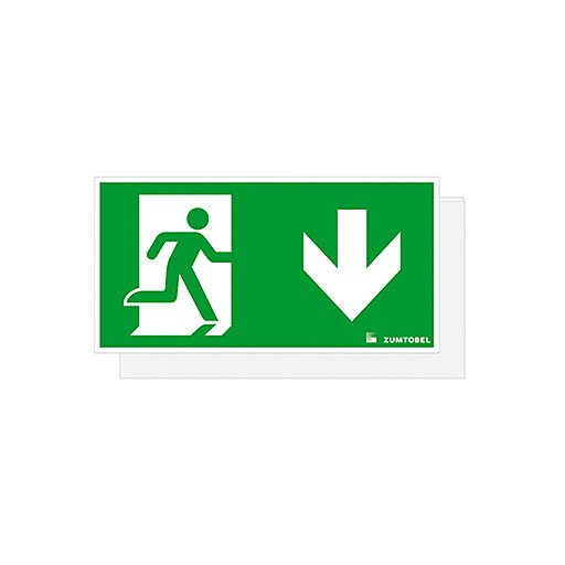 Sicherheitszeichen für CROSSIGN 110 MSC/TEC-GP, Abdeckung mit Sicherheitszeichen aus PC mit Digitaldruck, Sicherheitszeichen gemäß ISO 7010: 1seitig, Symbol: Rettungsweg/Notausgang. Richtungspfeil nach unten, Erkennungsweite gemäß EN 1838: 22 m, Abmessung: 222 x 5 x 110 mm, Gewicht: 0,19 kg.