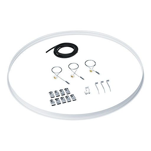 Einbauset für ONDARIA LED rund mit Durchmesser 1150mm. Zubehör bestehend aus Einbaurahmen für die Kaschierung der Deckenaussparung (Durchmesser Deckenaussparung 1175mm, Seilabhängung zur Montage an der Rohdecke, Dichtungsring für eine saubere Schattenfuge, Hilfsmittel zur Demontage. Gewicht: 2,24 kg