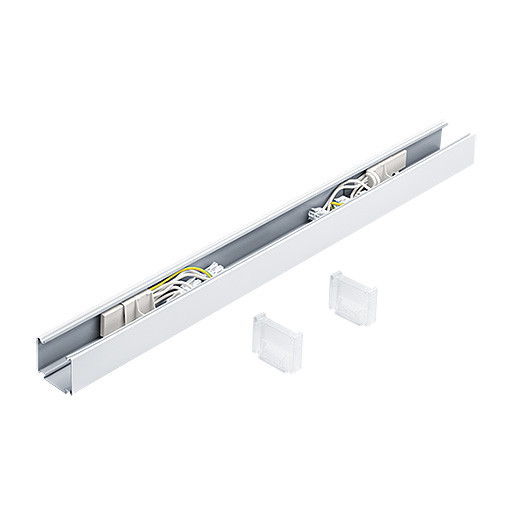 Elektrische Mitteleinspeisung L750 in weiß aus profiliertem Stahlblech für den mittigen elektrischen Anschluß oder einer mittigen Lastenaufteilung des Lichtbandes. 2 Sets mit steckbaren Anschlußklemmen für 5 Netzleitungen, 2 x 2 Notlichtleitungen und 2 Steuerleitungen. Berührungsschutz für Stromleitprofil. Die Mitteleinspeisung kann mit den Enden von zwei Leuchten, die mindestens eine Länge von 1000 mm haben oder mit Abdeckstreifen abgedeckt werden. Abmessungen: 750 x 60 x 54 mm, Gewicht: 1,45 kg