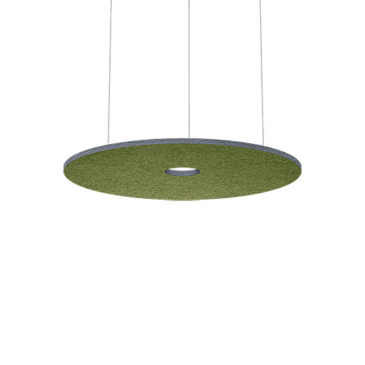 Akustisch wirksames Element, in welches eine Standard PANOS III Einbau R200 mit Deckenring montiert werden kann. Geeignet für die Absorption von Direktschall von unten, wie auch von Wänden und Decken reflektiertem Schall. Das Akustik Element ist aus hochwertigem, flammenhemmenden (C-s2-d0) Formvlies aus PET (30% Rezyklatanteil) in den Farben: Grundmaterial: anthrazit fleece, Farbschicht: Moss Green, Offene Kanten um noch bessere Absorptionsgrade zu erzielen. Pendelmontage mit drei Befestigungspunkten, Befestigungsset mit Drahtseil 2m, höhenverstellbar, bereists vormontierte eingesenkte Gewindehülsen. Abmessungen: Durchmesser 1000 x 25 mm, Gewicht: 2,84 kg