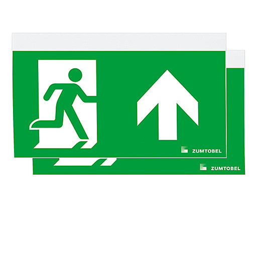 Sicherheitszeichen zur einfachen Montage auf das PURESIGN/COMSIGN 150 MSC/MRC Gehäuse, gleichmäßige Hinterleuchtung des Piktogramms, Leuchtdichte > 500 cd/m² im weißen Bereich, Piktogramm per Digitaldruck auf die Acrylglasplatte aufgebracht, Sicherheitszeichen gemäß ISO 7010: 2seitig, Symbol: Rettungsweg/Notausgang. Richtungspfeil nach oben, Erkennungsweite gemäß EN 1838: 30 m, Abmessung: 300 x 16 x 188 mm, Gewicht: 0,76 kg.