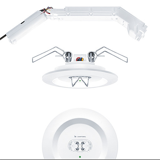 LED Sicherheitsleuchte zur Fluchtwegbeleuchtung mit min. 1 lux gemäß EN 1838, Raumhöhe 2,2 bis 7 m, 2 high power LEDs, neutralweiß 4.000 K, Linse aus Polycarbonat (PC), optimales Thermomanagement mittels Kühlblech, Decken-Einbauleuchte für 68 mm Deckenausschnitt und Deckenstärken von 1-25 mm, werkzeuglose Schnellmontage der Leuchte mittels speziell geformter Haltefedern, werkzeugloser Austausch von Akku und Betriebsgerät, Abdeckring aus Aluminiumdruckguss, pulverbeschichtet, Gehäusefarbe weiß (ähnlich RAL9016), Gerätebox für Deckeneinwurf aus Polypropylen (PP), Leuchte mit Einzelbatterieversorgung für 3 h Notlichtbetrieb in Dauer- oder Bereitschaftsschaltung, automatischer Test (Autotest) durch die Leuchte, optional zentrales Monitoring über DALI, Anzeige des Leuchtenstatus über Status-LED, NFC-Schnittstelle zur Adressierung, Konfiguration und Wartung durch PROset Pen (Artikelnr: 22170290) oder PROset App, Adressierung alternativ auch optisch oder per EZ-Adressierung möglich, Dauer- und Bereitschaftsschaltung: +5 °C bis +35 °C, Spannungsversorgung: 220-240 V AC (+/- 10 %), 50-60 Hz, Leuchten Leistung: 4,7 W (mit Batterie Schnell-Ladung in Dauerschaltung), typische Anschlussleistung (ohne Batterieladung): 3,2 W in Dauerschaltung /1,1 W in Bereitschaftsschaltung, Bereitschafts- und Dauerschaltung über Jumper sowie NFC-Schnittstelle einstellbar, IP40, SC1, Leuchte halogenfrei und silikonfrei verdrahtet, geeignet zum Einbau in separat zu bestellendes Betoneingießgehäuse, Steckklemmen zur Durchgangsverdrahtung bis zu 2,5 mm², Schlagfestigkeit: IK04, Abmessungen: Durchmesser 85 x 4 mm, Gewicht: 0,38 kg, Robuster, integrierter Akku mit 3-Jahresgarantie. Gültig gemäß Bestimmungen der Herstellergarantie, einsehbar unter https://www.zumtobel.com/media/downloads/Garantiebedingungen_DE.pdf, Akkugarantie ungültig, wenn Installation erst drei (3) Monate nach Lieferung EXW (Incoterms 2010) erfolgt