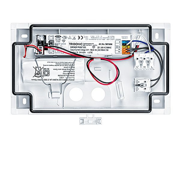 LED Sicherheitszeichenleuchte, Leuchte mit Einzelbatterieversorgung für 1 h Notlichtbetrieb in Dauer- oder Bereitschaftsschaltung, automatischer Test (Autotest) durch die Leuchte, optional zentrales Monitoring über DALI, Anzeige des Leuchtenstatus über Status-LED, Wand-Anbau, Gehäuse aus Polycarbonat (PC), weiß (RAL 9016), einspritzgegossen, NFC-Schnittstelle zur Adressierung, Konfiguration und Wartung durch PROset Pen (Artikelnr: 22170290) oder PROset App, Adressierung alternativ auch optisch oder per EZ-Adressierung möglich, einfache Montage der Leuchte. Wartungsfrei durch LED-Technologie, Steckklemmen 2,5 mm², Durchgangsverdrahtung möglich für 1,5 mm², Leuchten Leistung: 6,6 W, Schutzart: IP42, Schutzklasse: SC2, Schlagfestigkeit: IK03, Bereitschafts- und Dauerschaltung über Jumper sowie NFC-Schnittstelle einstellbar, Dauer- und Bereitschaftsschaltung: +5 °C bis +30 °C, Spannungsversorgung: 220-240 V AC (+/- 10 %), 50-60 Hz,, Abmessungen der Leuchte mit Sicherheitszeichen: 227 x 130 x 27 mm, Gewicht: 0,49 kg, Leuchte halogenfrei verdrahtet, Leuchte mit D-Kennzeichen (zur Verwendung in einer Umgebung, in der keine ungewöhnliche Staubablagerung erwartet wird), Robuster, integrierter Akku mit 3-Jahresgarantie. Gültig gemäß Bestimmungen der Herstellergarantie, einsehbar unter https://www.zumtobel.com/media/downloads/Garantiebedingungen_DE.pdf, Akkugarantie ungültig, wenn Installation erst drei (3) Monate nach Lieferung EXW (Incoterms 2010) erfolgt