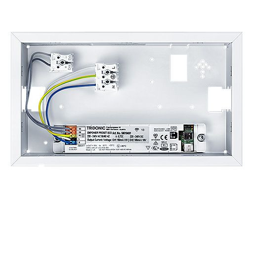 LED Sicherheitszeichenleuchte, Leuchte für zentrale Notlichtversorgung zur Einzelüberwachung der Leuchte über DALI (DALI-2 zertifiziert), einstellbarer Notlichtlevel, Wandeinbau, Gehäuse aus Stahlblech, weiß (RAL 9016), beschichtet, NFC-Schnittstelle zur Adressierung, Konfiguration und Wartung durch PROset Pen (Artikelnr: 22170290) oder PROset App, Adressierung alternativ auch optisch oder per EZ-Adressierung möglich, einfache Montage der Leuchte. Wartungsfrei durch LED-Technologie, Steckklemmen 2,5 mm², Durchgangsverdrahtung möglich für 1,5 mm², Leuchten Leistung: 6,2 W, Schutzart: IP40, Schutzklasse: SC1, Schlagfestigkeit: IK03, Bereitschafts- und Dauerschaltung möglich, Dauer- und Bereitschaftsschaltung: -40 °C bis +45 °C, Spannungsversorgung: 220-240 V AC (+/- 10 %) 50-60 Hz, 176-280 V DC,, Abmessungen der Leuchte mit Sicherheitszeichen: 232 x 135 x 54 mm, Gewicht: 0,6 kg, Leuchte halogenfrei verdrahtet, Leitungslänge von der Notstromquelle zur letzten Leuchte max. 300 m,