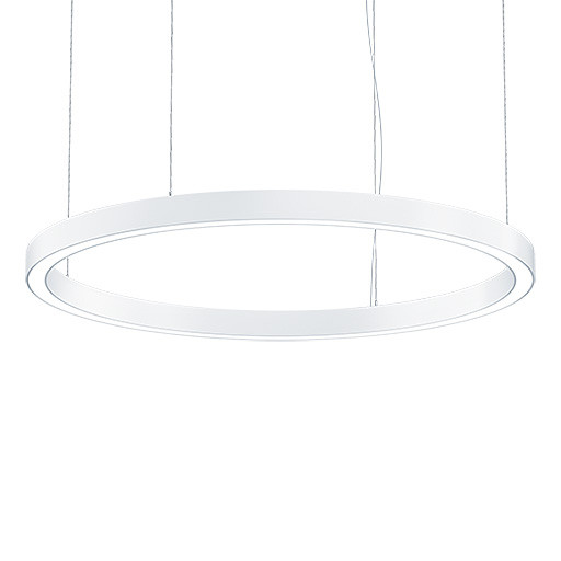 Ringförmige, direkt/indirekt strahlende LED Pendelleuchte, mit schlankem Aluminium Profilgehäuse in Farbe weiß und Opal Optik. Leuchten Leistung: 91,9 W, DALI steuerbare Leuchte mit LED-Konverter, separate Steuerung des Direkt/Indirektlichts, LED-Lebensdauer 50000 h bis zu einem Lichtstromrückgang auf 90 % des Anfangswertes. Farborttoleranz (initial MacAdam): 3. Leuchten Lichtstrom: 8948 lm, Leuchten Lichtausbeute: 97 lm/W. Farbwiedergabe Ra > 90, Farbtemperatur 3000 K. Lichtlenkung über opale-Optik mit Mehrschichtaufbau für definierte Auskopplung mit UGR < 22. Gehäuse aus gerolltem Aluminiumstrangpressprofil, nahtlos verschweißt, weiß pulverbeschichtet für ein hochwertiges Oberflächenfinish, Abhängeseile und Montagezubehör werden mitgeliefert, Deckenbaldachin ist separat zu bestellen. Leuchte halogenfrei verdrahtet. Länge Abhängeseile: 3m. Glühdrahtprüfung: 650°C, Leuchte halogenfrei und silikonfrei verdrahtet, Abmessungen: Durchmesser 1500 x 85 mm, Gewicht: 11 kg.