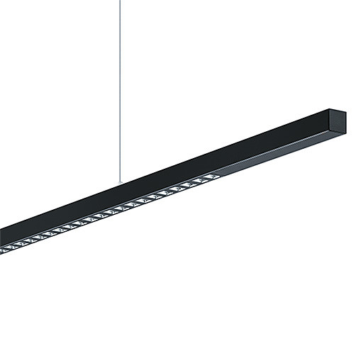 Puristische direkt / indirekt LED Pendelleuchte mit ultra-schmalem Design und Mikro-Reflektor-Optik. Separater Steuerung des Direkt/Indirektlichts. Innovative elektrische Lösung für Einspeisung und Lichtsteuerung über Abhängeseile. Leuchten Leistung: 60 W LED, DALI steuerbare Leuchte (DALI only) mit LED-Konverter. LED-Lebensdauer 50000 h bis zu einem Lichtstromrückgang auf 95 % des Anfangswertes. Farborttoleranz (initial MacAdam): 3. Leuchten Lichtstrom: 5690 lm, Leuchten Lichtausbeute: 95 lm/W.Farbwiedergabe Ra > 80, Farbtemperatur 3000 K. Abstrahlcharakteristik indirekt/direkt im Verhältnis 65:35. Blendbegrenzung nach EN 12464-2011 mit L65 < 2000 cd/m² und UGR < 16 für Bildschirmarbeitsplätze. Lichtlenkung direkt über Micro-Reflektor-Optik aus hochwertigem Verbundwerkstoff. Lichtlenkung indirekt über Spezialoptik mit breiter, homogener Abstrahlcharakteristik. Reflektor mit facettierter Oberfläche gleichmäßig vakuumbedampft mit hochreflektivem Reinstaluminium. Reflektorrahmen in Mikrostrukturlack in schwarz, matt.Leuchtengehäuse aus kantigem Aluminiumstrangpressprofil pulverbeschichtet in schwarz mit einem Querschnitt von 25 x 25 mm, unsichtbare verschraubte Aluminium-Druckguss-Stirnteile in Leuchtenfarbe in schwarz. Leuchtenabmessung: 1474 x 25 x 25 mm. Seilabhängung vormontiert in Länge 3000 mm, ablängbar. Gerätebox Deckenanbau in schwarz. Externe Gerätebox für Anbauinstallation (Beton) in Abmessung: 787 x 50 x 25 mm. Leuchte halogenfrei verdrahtet. Gewicht: 5 kg.