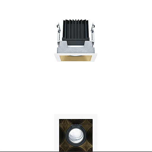 LED Decken-Einbauleuchte (Komplettleuchte, adjustable), mit innovativer Linsentechnologie, werkzeuglose, intuitive Einstellung des Lichtkegels über zwei verdrehbare Linsen aus PMMA, bei eingeschalteter Leuchte, Lichtkegel 360° drehbar und bis 30° schwenkbar, homogene Lichtverteilung mit hoher Leuchtenintensität, geschlossenes Lichtsystem erzeugt ruhiges Deckenbild unbahängig von der eingestellten Lichtrichtung, Bestückung: 22 W LED930, FLOOD-Abstrahlcharakteristik, Reflektor: glatt, goldfarben beschichtet und matt (24 °), Farbwiedergabe Ra > 90, Farbtemperatur 3000 K (warm weiß), Farborttoleranz (initial MacAdam): 3, Leuchten Lichtstrom: 760 lm, Leuchten Lichtausbeute: 35 lm/W, Lebensdauer: 50000h bei 85% Lichtstrom, mit separater Vorschaltgeräte-Einheit DALI steuerbare Leuchte (DALI only), hochwertige optische Einheit intergriert im optimierten Wärmemanagement aus Aluminiumdruckguss, Reflektor/Abdeckrahmen eine Einheit aus hochwertigem, UV-beständigem Polycarbonat (PC), Abdeckrahmen weiß, Einbaurahmen aus Aluminiumdruckguss, werkzeuglose Schnellmontage der Leuchteneinheit über EASY-CLICK-Verschluss, IP20, Leuchte halogenfrei verdrahtet, Anschluss: 5-polige Steckverbindungsklemme, Durchschleifen möglich, Netzspannung: 220-240V / 0/50/60Hz, Montage: werkzeuglose Schnellmontage mittels Haltefedern für Deckenstärken von 1-25mm, Deckenausschnitt: 100x100mm, Einbautiefe: 123mm, Gewicht: 0,73 kg