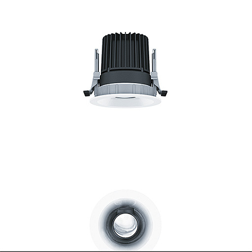 LED Decken-Einbauleuchte (Komplettleuchte, adjustable), mit innovativer Linsentechnologie, werkzeuglose, intuitive Einstellung des Lichtkegels über zwei verdrehbare Linsen aus PMMA, bei eingeschalteter Leuchte, Lichtkegel 360° drehbar und bis 30° schwenkbar, homogene Lichtverteilung mit hoher Leuchtenintensität, geschlossenes Lichtsystem erzeugt ruhiges Deckenbild unbahängig von der eingestellten Lichtrichtung, Bestückung: 15 W LED930, SPOT-Abstrahlcharakteristik, Reflektor: glatt, weiß lackiert (15 °), Farbwiedergabe Ra > 90, Farbtemperatur 3000 K (warm weiß), Farborttoleranz (initial MacAdam): 3, Leuchten Lichtstrom: 470 lm, Leuchten Lichtausbeute: 31 lm/W, Lebensdauer: 50000h bei 85% Lichtstrom, mit separater Vorschaltgeräte-Einheit DALI steuerbare Leuchte (DALI only), hochwertige optische Einheit intergriert im optimierten Wärmemanagement aus Aluminiumdruckguss, Reflektor/Abdeckring eine Einheit aus hochwertigem, UV-beständigem Polycarbonat (PC), Abdeckring weiß, Einbauring aus Polycarbonat glasfaserverstärkt (PC), grau, werkzeuglose Schnellmontage der Leuchteneinheit mittels Bajonettverschluss, IP20, Leuchte halogenfrei verdrahtet, Anschluss: 5-polige Steckverbindungsklemme, Durchschleifen möglich, Netzspannung: 220-240V / 0/50/60Hz, Montage: werkzeuglose Schnellmontage mittels Anti-Rutsch-Haltefedern für Deckenstärken von 1-40mm, Deckenausschnitt: 100mm, Einbautiefe: 125mm (für Deckenstärken von 1-25mm), Gewicht: 0,67 kg