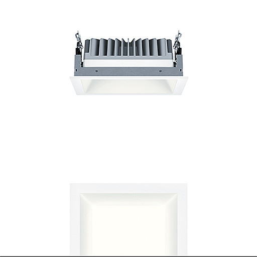 LED Decken-Einbauleuchte (Komplettleuchte), Einsatz bei limitiertem Platz in der Decke: Einbautiefe nur 100mm, LED Leuchte "tunableWhite", mit dynamischer Farbtemperaturveränderung bei gleichbleibendem Leuchtenlichtstrom über DALI-Signal (DT8 Standard) einstellbar, symmetrisch, breitstrahlende Lichtverteilung mit höchster Leuchteneffizienz und optimaler Lichttechnik, Bestückung: LED1800-927-65, Farbwiedergabe Ra > 90, Farbtemperatur (tunable) 2700-6500 K (warmweiß-neutralweiß-tageslichtlichtweiß), Farborttoleranz (initial MacAdam): 3, Leuchten Leistung: 23 W, Leuchten Lichtstrom: 2100 lm, Leuchten Lichtausbeute: 91 lm/W, Lebensdauer: 50000h bei 80% Lichtstrom, mit separater Vorschaltgeräte-Einheit DALI steuerbare Leuchte (DALI only), Dimmbereich: 1-100%, inklusive "Fade-to Zero", hochwertige Reflektoreinheit über Verrastung an modulare LED Lichtkammer befestigt, hocheffiziente LED Lichtkammer integriert im optimierten, passiven Wärmemanagement aus Aluminiumdruckguss, Reflektor:glatt, weiß lackiert, Reflektor/Abdeckrahmen eine Einheit aus hochwertigem, UV-beständigem Polycarbonat (PC), Abdeckrahmen weiß, abnehmbar, Einbaurahmen aus Aluminiumdruckguss, werkzeuglose Schnellmontage der Leuchteneinheit über EASY-CLICK-Verschluss, IP44_IP20, Leuchte halogenfrei verdrahtet, Anschluss: 5-polige Steckverbindungsklemme, Durchschleifen möglich, Netzspannung: 220-240 V / 0/50/60 Hz, Zentralbatterietauglich 220V DC , Montage: werkzeuglose Schnellmontage mittels Haltefedern für Deckenstärken von 1-25mm, Deckenausschnitt: 190x190mm, Einbautiefe: 100mm, Gewicht: 1,5 kg Hinweis: Für Office Anwendungen gemäß EN12464 (UGR<19, Reflektortyp aluminiumbesputtert) ist ein zusätzlicher Entblendungsrahmen separat zu bestellen