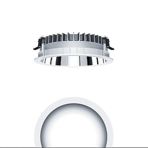LED Decken-Einbauleuchte (Komplettleuchte) R200, symmetrisch, breitstrahlender Lichtverteilung (82 °), höchste Leuchteneffizienz und eine optimale Downlight Lichttechnik, hohe Nachhaltigkeit aufgrund durchgängigen, maximal- modularen Aufbau und austauschbaren Komponenten, Austauschbares LED-Modul, Farbwiedergabe Ra > 80, Farbtemperatur 4000 K, Farborttoleranz (initial MacAdam): 2, Leuchten Leistung: 37,2 W, Leuchten Lichtstrom: 5590 lm, Leuchten Lichtausbeute: 150 lm/W, Mittlere Bemessungslebensdauer: L85 100000 h bei 25 °C + L90 50000 h bei 25 °C, mit separaten, steckbaren LED-Konverter, DALI steuerbare Leuchte (DALI only) mit DC-Funktion, einstellbar 1-100 %, Notstromlevel auf 15% voreingestellt, DALI konfigurierbar, SwitchDIM-kompatibel, hochwertige Reflektoreinheit über Bajonettverschluss an modularer LED-Lichtkammer arretiert, hocheffiziente LED Lichtkammer integriert im optimierten, passiven Wärmemanagement aus recycelten Aluminiumdruckguss, Reflektor/Abdeckring aus hochwertigem, UV-beständigem Polycarbonat (PC), Reflektor: aluminiumbesputtert, hochglänzend, irisierungsfrei, Abdeckring: weiß, Einbauring aus Polycarbonat (PC), weiß, Schutzart: IP54_IP20, Leuchte halogenfrei verdrahtet, Anschluss: 5-polige Steckverbindungsklemme, Durchschleifen möglich, Netzspannung: 220-240 V / 0/50/60 Hz, Zentralbatterietauglich 220-240V DC, Montage: werkzeuglose Schnellmontage mittels Anti-Rutsch-Haltefedern für Deckenstärken von 1-25mm (je nach Leuchtenvariante) aufgrund austauschbarer Haltestege, werkzeuglose Schnellmontage der Leuchteneinheit mittels Bajonettverschluss, Deckenausschnitt: 200mm, Einbautiefe: 75mm, Gewicht: 1,03 kg Geringe Einbautiefe bei Einsatz mit limitiertem Platz in der Decke.