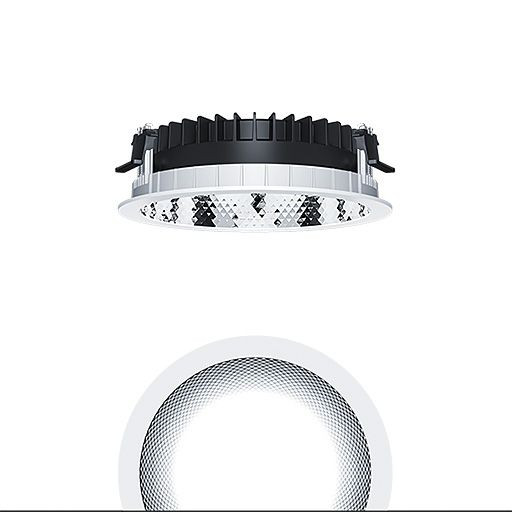 LED Decken-Einbauleuchte (Komplettleuchte) R200, mit symmetrisch, breitstrahlender Lichtverteilung (83 °), höchste Leuchteneffizienz und eine optimale Downlight Lichttechnik, hohe Nachhaltigkeit aufgrund durchgängigen, maximal- modularen Aufbau und austauschbaren Komponenten. Austauschbares LED Modul, symmetrisch, breitstrahlender Lichtverteilung, Farbwiedergabe Ra > 80, Farbtemperatur 3000 K, Farborttoleranz (initial MacAdam): 2, Leuchten Leistung: 13,8 W, Leuchten Lichtstrom: 2100 lm, Leuchten Lichtausbeute: 152 lm/W, Mittlere Bemessungslebensdauer: L80 100000 h bei 25 °C + L90 50000 h bei 25 °C, mit separaten, steckbaren LED-Konverter, schaltbare Leuchte, hochwertige Reflektoreinheit über Bajonettverschluss an modularer LED-Lichtkammer arretiert, hocheffiziente LED Lichtkammer integriert im optimierten, passives Wärmemanagement aus hochwertigem wärmeleitendem Polycarbonat, Reflektor/Abdeckring aus hochwertigem, UV-beständigem Polycarbonat (PC), Reflektor: facettiert, aluminiumbesputtert, hochglänzend, irisierungsfrei, Abdeckring: weiß, Einbauring aus Polycarbonat (PC), weiß, Schutzart: IP54, Leuchte halogenfrei verdrahtet, Anschluss: 3-polige Steckverbindungsklemme, Durchschleifen möglich, Netzspannung: 220-240 V / 0/50/60 Hz, Zentralbatterietauglich 220-240V DC, , Montage: werkzeuglose Schnellmontage mittels Anti-Rutsch-Haltefedern für Deckenstärken von 1-25mm (je nach Leuchtenvariante) aufgrund austauschbarer Haltestege, werkzeuglose Schnellmontage der Leuchteneinheit mittels Bajonettverschluss, Deckenausschnitt: 200mm, Einbautiefe: 75mm, Gewicht: 0,65 kg Geringe Einbautiefe bei Einsatz mit limitiertem Platz in der Decke.