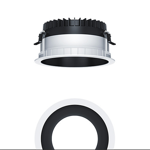 LED Decken-Einbauleuchte (Komplettleuchte) R200, symmetrisch, breitstrahlender Lichtverteilung (77 °), höchste Leuchteneffizienz und eine optimale Downlight Lichttechnik, hohe Nachhaltigkeit aufgrund durchgängigen, maximal- modularen Aufbau und austauschbaren Komponenten, Austauschbares LED-Modul, Farbwiedergabe Ra > 90 (R9>50), Farbtemperatur 4000 K, Farborttoleranz (initial MacAdam): 2, Leuchten Leistung: 17,7 W, Leuchten Lichtstrom: 1720 lm, Leuchten Lichtausbeute: 97 lm/W, Mittlere Bemessungslebensdauer: L90 100000 h bei 25 °C + L95 50000 h bei 25 °C, mit separaten, steckbaren LED-Konverter, schaltbare Leuchte, hochwertige Reflektoreinheit über Bajonettverschluss an modularer LED-Lichtkammer arretiert, hocheffiziente LED Lichtkammer integriert im optimierten, passives Wärmemanagement aus hochwertigem wärmeleitendem Polycarbonat, Reflektor/Abdeckring aus hochwertigem, UV-beständigem Polycarbonat (PC), Reflektor: schwarz lackiert, Abdeckring: weiß, Einbauring aus Polycarbonat (PC), weiß, Schutzart: IP54_IP20, Leuchte halogenfrei verdrahtet, Anschluss: 3-polige Steckverbindungsklemme, Durchschleifen möglich, Netzspannung: 220-240 V / 0/50/60 Hz, Zentralbatterietauglich 220-240V DC, Montage: werkzeuglose Schnellmontage mittels Anti-Rutsch-Haltefedern für Deckenstärken von 1-40mm (je nach Leuchtenvariante) aufgrund austauschbarer Haltestege, werkzeuglose Schnellmontage der Leuchteneinheit mittels Bajonettverschluss, Deckenausschnitt: 200mm, Einbautiefe: 120mm, Gewicht: 1,07 kg Für Office Anwendungen gemäß EN12464 (UGR<19 Reflektortyp aluminiumbesputtert)