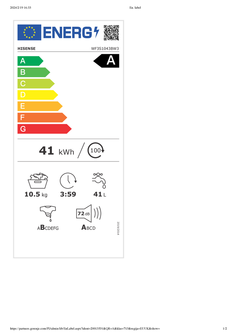 | Energieeffizienzklasse nur Waschzyklus (2019/2014/EU) | A |