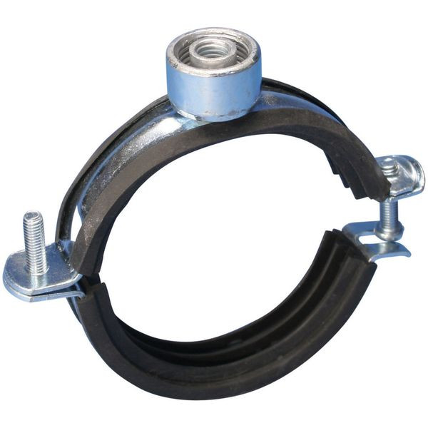 Rohrschelle mit Kombi-Gewindemutter, Schnellverschluss und EPDM-Isolierung für nicht isolierte Metallrohre. Mit einfachem Schließmechanismus, M8 / M10 / 1/2"-Kombianschluss und EPDM-SBR-Gummi-Schallisolierung, für Rohre 108–118 mm.